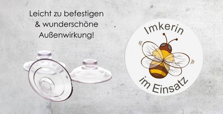 Mit diesen Aufklebern und Plaketten setzen Sie ein deutliches Zeichen für Ihr Umfeld und zeigen, dass Sie sich mit Leidenschaft für die Bienen einsetzen. Ob hinter der Windschutzscheibe oder am Heckfenster Ihres Imkerfahrzeugs - unsere Hinterglasschilder mit transparentem Saugnapf sind flexibel und einfach anzubringen. Wählen Sie zwischen viele verschiedenen Designs speziell für Imker und für Imkerinnen. Die Plaketten besteht auch einem festen Kunststoff und zeigen einen besonders hochwertigen, lichtstabilen UV-Druck. der auch mehrere Jahre die direkte Sonneneinstrahlung ohne Verbleichen aushält. Die Plaketten sind mit einem transparenten Saugnapf ausgestatte, der die Befestigung besonders einfach macht und einen schnellen und rückstandsfreien Austausch ermöglicht.