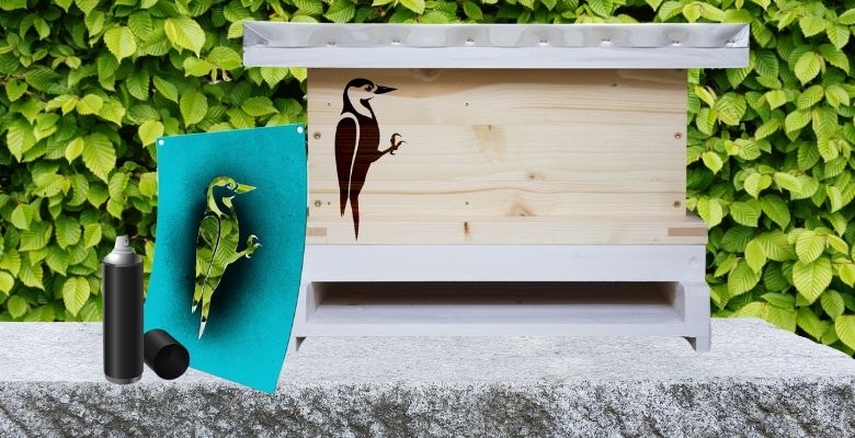 Die Spray- und Malschablone zur Applikation von Spechten auf verschiedenen Untergründen, schützt Holz- und Kunststoffbeuten vor den zerstörerischen Attacken von Spechten.